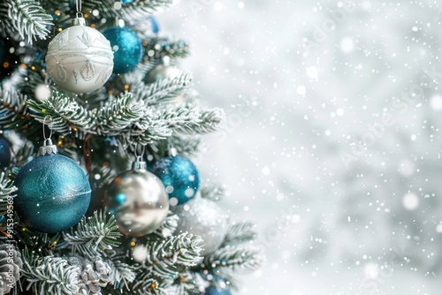 Close-Up of a Snow-Covered Christmas Tree with Silver Ornaments: A Festive and Serene Holiday Display with Winter Charm