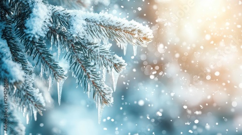 Close-up of a snow-covered evergreen branch with icicles, creating a serene winter scene with soft bokeh in the background.