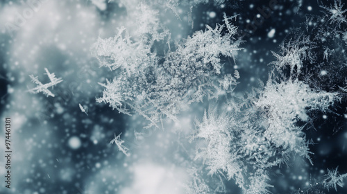 Close-up of a snowy backdrop with a dense pattern of frost-covered snowflakes on a dark blue background, creating a textured and immersive effect