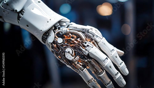 Close-up of a sophisticated robotic hand, showcasing intricate mechanical details.