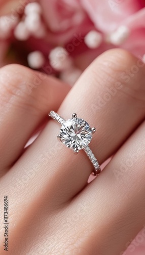 Close-up of a sparkling diamond ring on a finger, delicate and elegant.