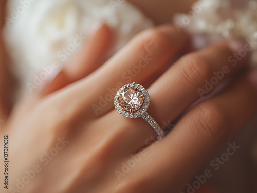Close-up of a sparkling engagement ring on a hand, showcasing the elegant design and brilliance of the diamond in soft, romantic lighting.