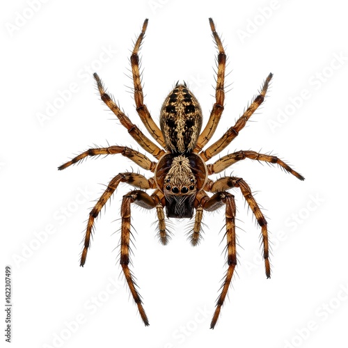 Close-up of a spider with striped legs and distinct markings, showcasing its intricate anatomy and coloration.