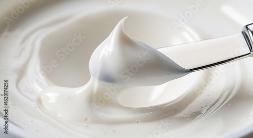 Close-up of a Spoon Scooping Creamy White Yogurt or Sour Cream