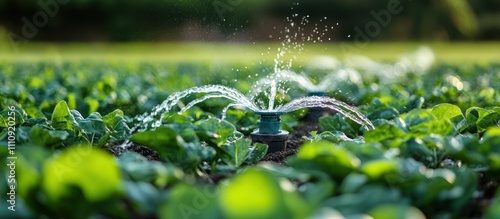 Close-up of a sprinkler watering a field of green leafy vegetables.