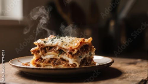 Close-up of a steaming lasagna slice on a plate, rustic setting with warm lighting