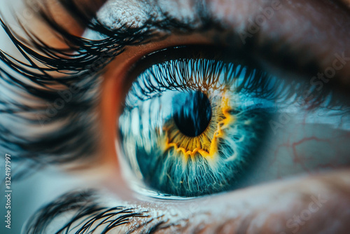 Closeup of a striking blue eye with yellow iris and long eyelashes art gaze look macro human color