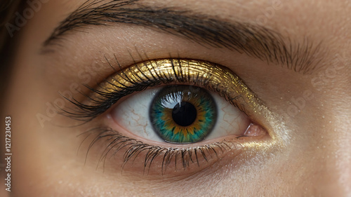 Close-Up of a Stunning Blue Eye with Sunburst Iris and Gold Glitter Eyeshadow Detail