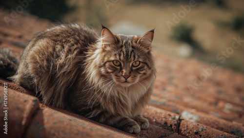 Close-up of a tabby cat on a terracotta tiled roof in the south of France