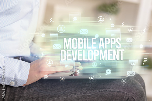 Close-up of a tablet searching MOBILE APPS DEVELOPMENT inscription, modern technology concept