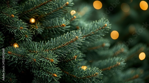 Close-up of a teal-green Christmas tree with warm-toned lights out-of-focus in the background