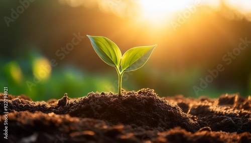 Close-up of a tender sprout with soft, curling leaves, pushing through the moist earth, gent