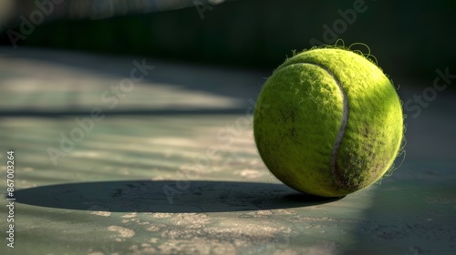 Close-up of a tennis ball on a court with shadow, sports equipment. Leisure activity and recreation concept