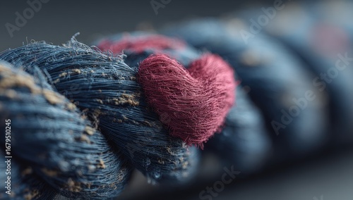 Close-up of a textured rope, a small, soft pink heart nestled within the strands