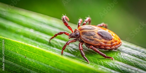 Close-up of a tick crawling on a green leaf, parasite, insect, disease, bloodsucker, wildlife, macro, nature, creepy