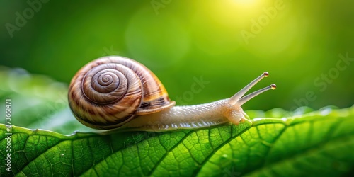 Closeup of a tiny spiral-shelled snail crawling on a lush green leaf in a natural garden setting, snail, spiral, shell, tiny