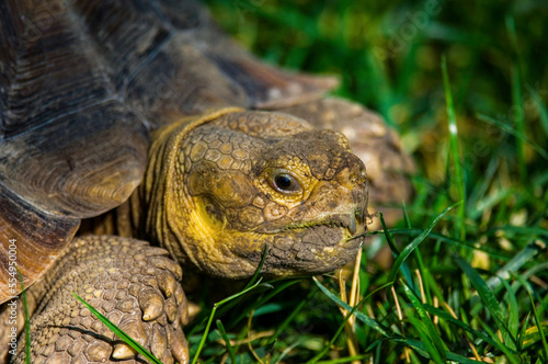 Close-up of a tortoise on grass at a zoo; Lincoln, Nebraska, United States of America