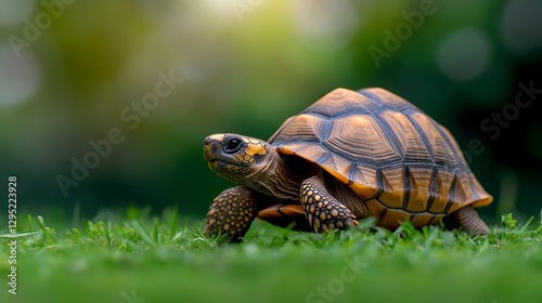Close-up of a tortoise walking on lush green grass in a serene outdoor environment