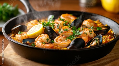 Close-up of a traditional seafood paella in a pan, featuring shrimp, mussels, rice, and garnished with lemon
