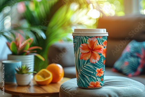 Close-up of a travel coffee cup with a floral print on a cushion, surrounded by houseplants and fruit