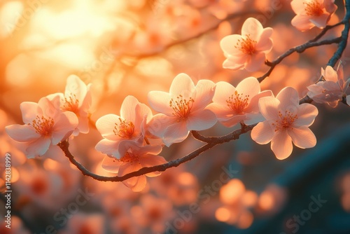 Close-up of a tree branch with colorful flowers blooming, suitable for spring or nature-themed designs