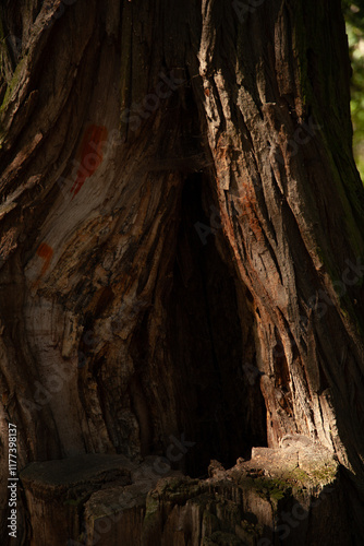 Close-up of a tree trunk's textured bark, revealing a hollowed-out section, with sunlight illuminating the details.