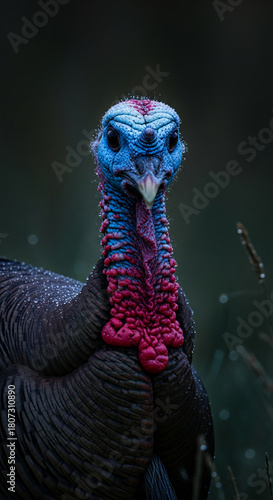 Close-up of a turkey's head and neck with blue and red textured skin and brown feathers, representing wildlife and nature exploration