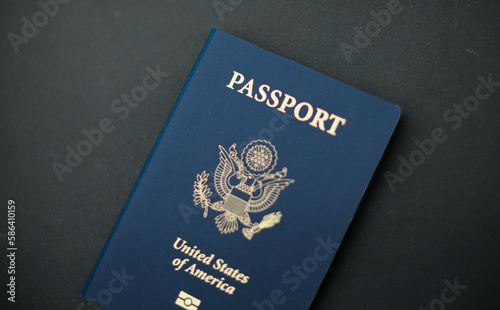 Close-up of a US passport with immigration, visa, citizenship, and travel paperwork on a wooden table