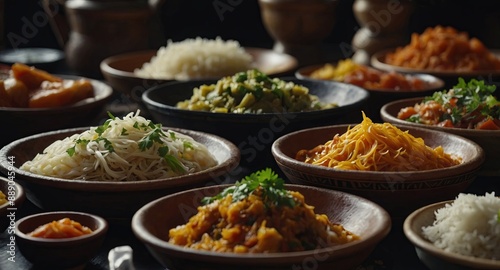 Close-up of a variety of traditional foods from around the world, cultural diversity in cuisine.
