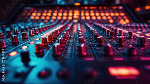 Close-up of a vibrant audio mixing console with illuminated controls.