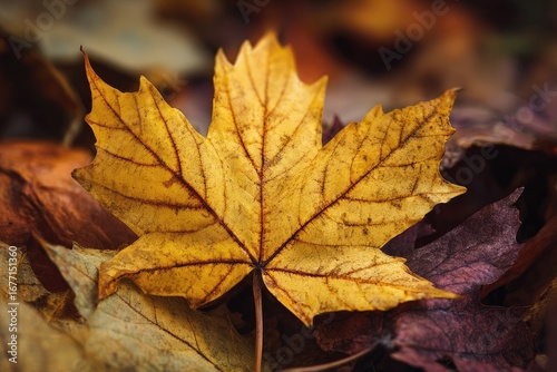 Close-up of a vibrant autumn leaf amidst fallen foliage