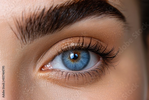 Close-up of a vibrant blue eye with long eyelashes and well-groomed eyebrows, highlighting fine details and textures for a captivating visual effect
