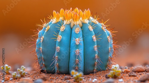 Close-up of a vibrant blue globe cactus with orange blossoms, set against a blurred orange background.