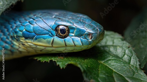 Close-up of a vibrant blue snake's head nestled amongst lush green leaves in a forest environment. Possible use Nature, wildlife, education