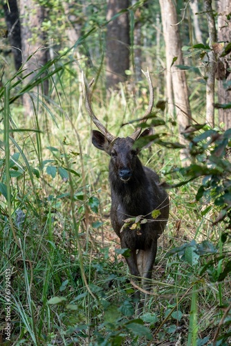 Closeup of a vibrant deer in a lush green forest on a sunny day