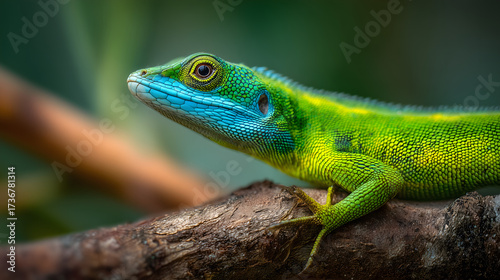 Close-up of a vibrant green and blue lizard resting on a tree branch in natural habitat, showing detailed scales and vivid colors with a soft blurred background.