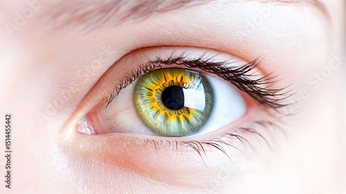Close-up of a vibrant green eye with a unique, sunburst-like iris pattern, detailed lashes, and soft skin tones