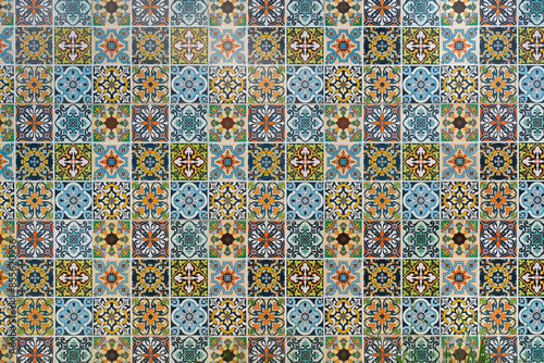 Close-up of a vibrant, intricate mosaic of colorful ceramic tiles, featuring geometric and floral patterns in various hues.