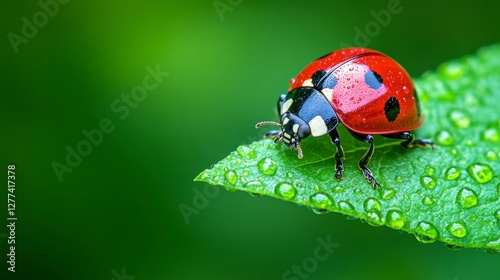 Close-up of a vibrant ladybug resting on a dew-covered leaf in a lush green environment