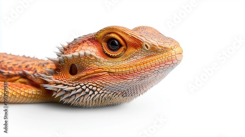 Close-up of a vibrant orange bearded dragon with intricate scales and a calm expression against a white background.