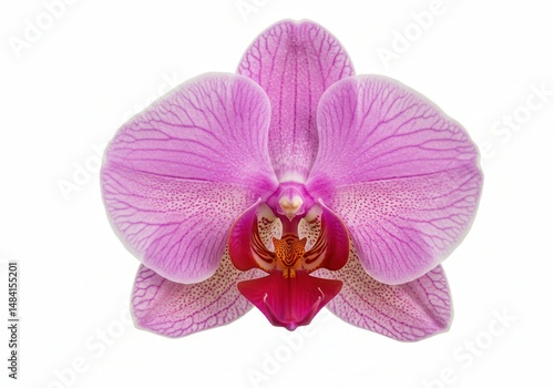 Close-up of a vibrant pink and red phalaenopsis orchid blossom on white