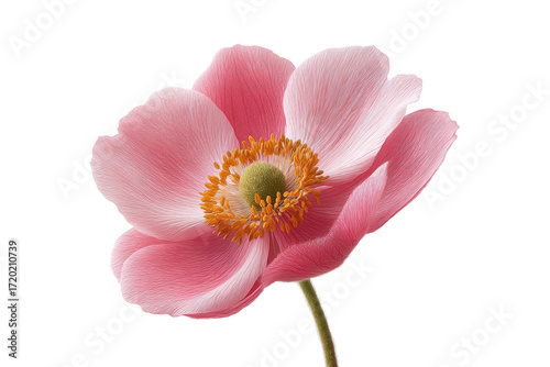 Close-up of a vibrant pink anemone flower with detailed petals and yellow center, cut out