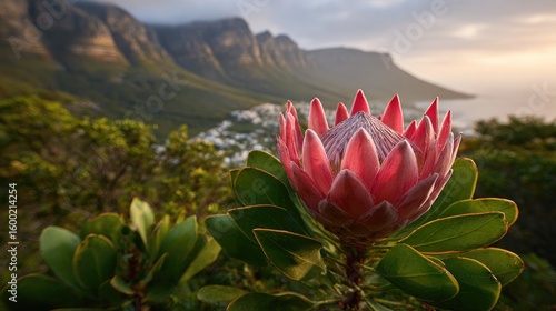 Close-up of a vibrant protea flower against a backdrop of mountains and coastline.
