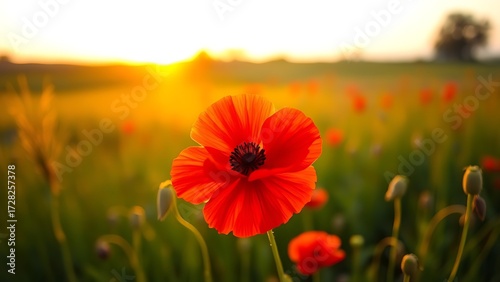 Close-up of a vibrant red poppy bathed in golden sunset light in a peaceful field.