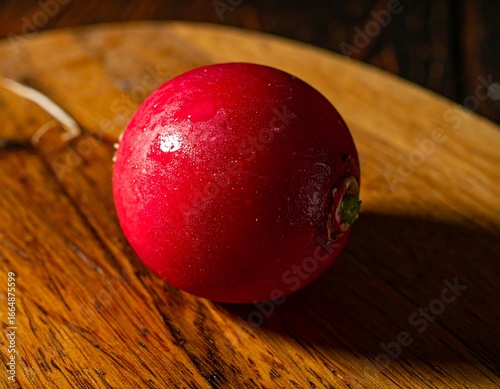 Close-up of a vibrant red radish on a wooden board