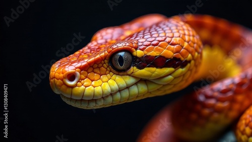 Close-up of a vibrant reptile with fiery orange and yellow scales, its intense gaze captivating against a dark background, showcasing intricate details of its head and body
