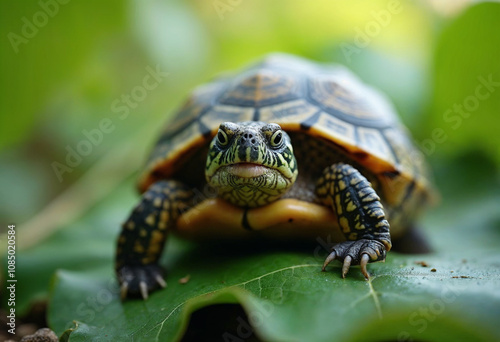 Close-Up of a Vibrant Turtle on a Leaf in Nature