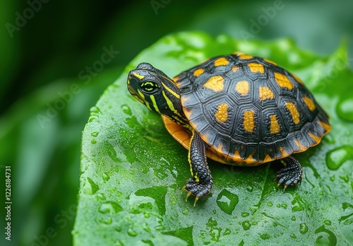 Close-up of a vibrant turtle resting on a leafy surface with water droplets highlighting its intricate shell patterns in a lush green environment