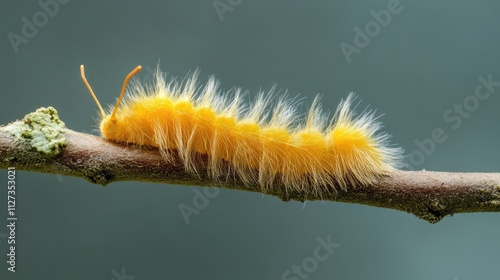 Close-up of a vibrant yellow caterpillar climbing a twig showcasing fine hair-like structures against a blurred natural background