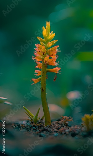 Close-up of a vibrant yellow-orange succulent plant sprouting from dark soil against a blurred green background.